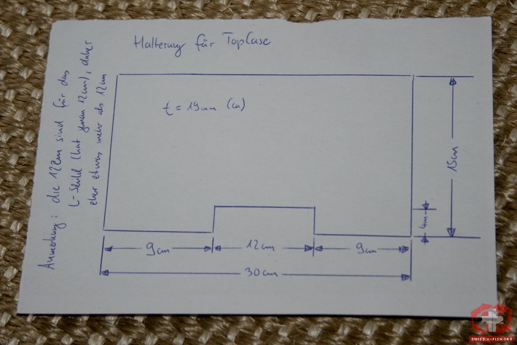 Noch vor dem Putzen hatte ich bereits gestern mittels Pappkarton und Taschenmesser eine kleine Schablone gebastelt gehabt. Das vom Vorbesitzer sozusagen gratis dazugegebene Topcase hatte keine passende Halterung für den Roller. Daher wollte ich etwas Selbstkonstruiertes haben.