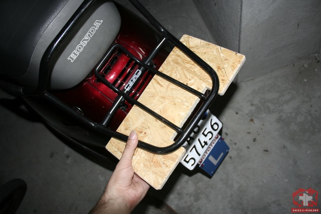 Das ebenfalls schon reichlich ausgebleichte Topcase von IXS wurde einfach durch die bereits vorhandenen drei Löcher mit dem Holzbrett verschraubt. Dazwischen befindet sich der Gepäckträger des Honda Spacy.