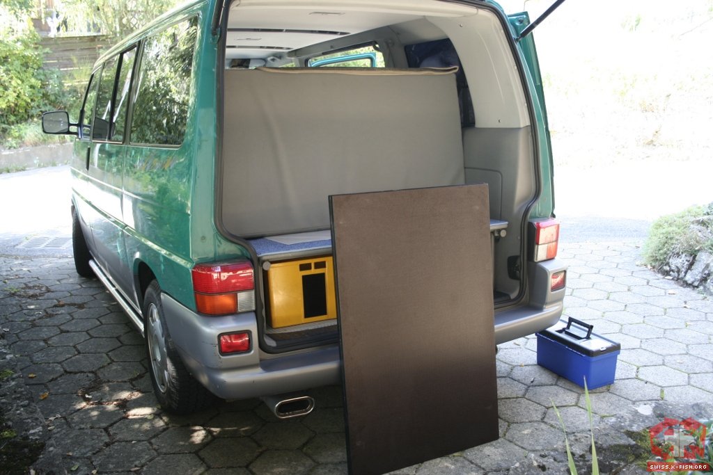 Die beiden Tischplatten, welche mir auf den Krankentragengestellen als Schreib- und Tastaturauflage dienen habe ich mir so zusägen lassen, dass sie exakt unter die Matratze im Heck von meinem VW T4 passen.